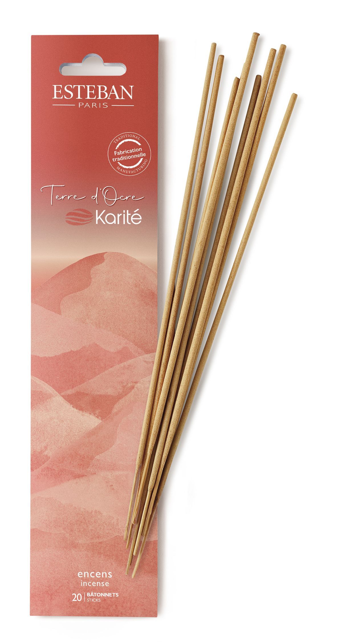 Incienso Karité de Esteban Paris, con 20 varillas de madera natural para perfumar tu hogar con un aroma cálido y terroso. Fabricado tradicionalmente, ideal para crear un ambiente relajante y sofisticado. Perfecto para amantes de fragancias naturales y aromaterapia.