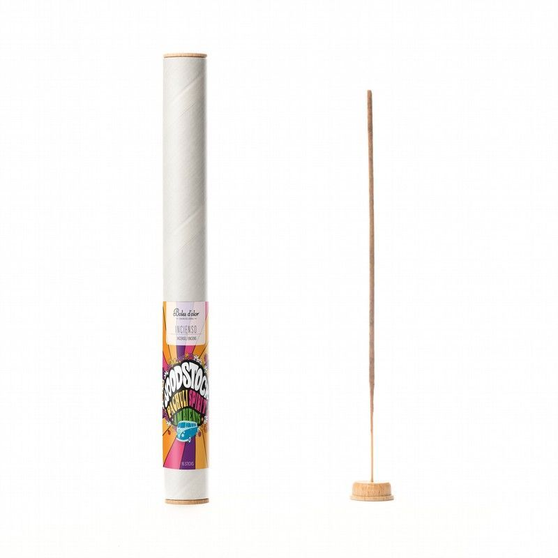 Incienso Woodstock en tubo de cartón con diseño psicodélico y colores vibrantes. Ideal para crear una atmósfera relajante y aromática en tu hogar. Incluye 16 varillas de incienso de madera con base de madera para una experiencia sensorial única. Perfecto para amantes de la decoración bohemia y aromaterapia.