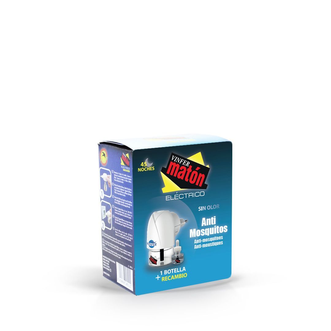 Insecticida eléctrico Víver Matón, sin olor, ideal para proteger tu hogar de mosquitos durante hasta 45 noches. Incluye 1 botella y 1 recambio. Diseño compacto y eficaz, perfecto para uso en dormitorios y espacios interiores. Solución práctica y segura para disfrutar de noches tranquilas sin molestias de insectos.