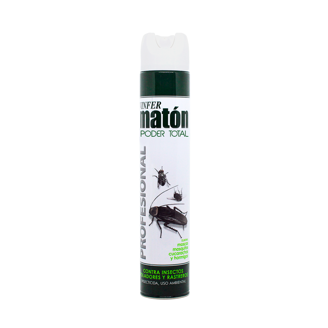 Insecticida spray profesional Matón Poder Total de 750ml, ideal para eliminar insectos, arañas y roedores en el hogar. Fórmula potente y eficaz para uso doméstico. Envase práctico con pulverizador para una aplicación fácil y rápida. Protege tu hogar con un producto confiable y de alta calidad.
