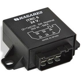 Relé de intermitencia para vehículos de 24 V, con detección por apagado de lámpara, fabricado en plástico resistente. Ideal para sistemas eléctricos de vehículos motorizados, ofrece protección contra fallos de lámparas y funcionamiento seguro. Compatible con cargas de hasta 120 W. Diseño compacto y robusto para instalación fácil.