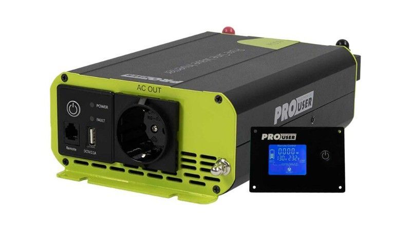 Inversor de onda sinusoidal pura PSI600 de 600W, ideal para vehículos y uso móvil. Con carcasa robusta en negro y verde, salida AC europea, puerto USB y pantalla LCD para monitoreo. Perfecto para alimentar dispositivos electrónicos en caravanas, barcos o emergencias. Alta eficiencia y diseño compacto para mayor comodidad.