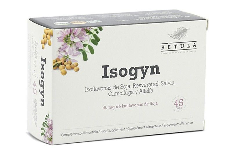 Isogyn, complemento alimenticio en caja de 45 cápsulas con isoflavonas de soja, resveratrol, salvía, cimicifuga y alfalfa. Ideal para mujeres que buscan apoyo durante la menopausia. Formulado con ingredientes naturales para ayudar a mantener el bienestar hormonal. Envase elegante con diseño floral y detalles en tonos suaves.