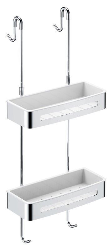 Jabonera doble AC-359 Pyp para mampara o pared, con bandejas blancas de plástico y estructura de acero inoxidable. Diseño elegante y funcional para mantener el baño organizado. Ideal para colocar jabón, cepillos o accesorios de baño. Fácil instalación y resistente al agua.