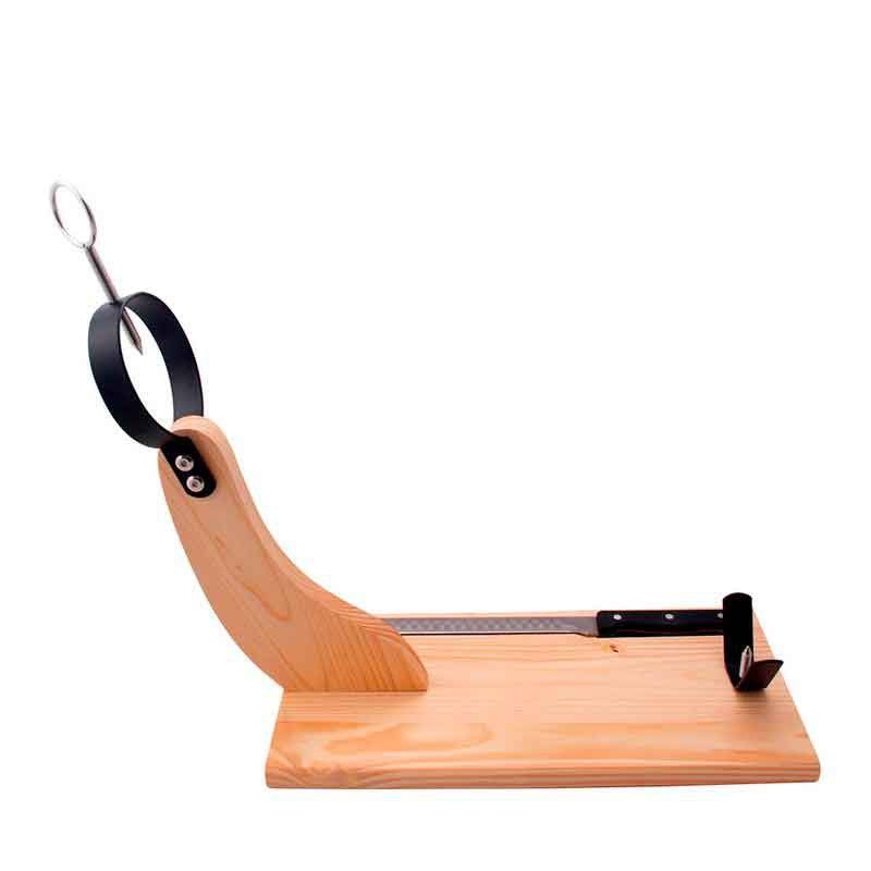 Jamonero de madera de pino claro con acabado natural, ideal para cortar jamón con precisión. Incluye cuchillo con mango negro y gancho metálico para colgar. Diseño elegante y funcional para tu cocina o mesa de comedor. Perfecto para amantes del jamón y entornos gastronómicos.