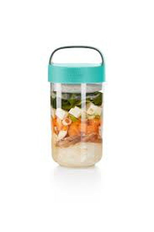 Jar to go de 600 ml de Lekue, ideal para llevar comidas saludables al trabajo o al colegio. Fabricado en plástico resistente y con tapa turquesa con asa, permite mantener los alimentos frescos y organizados en capas. Perfecto para ensaladas, arroces o bocadillos. Fácil de transportar y lavar.