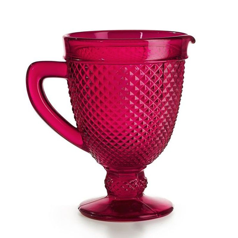 Jarra Bicos en color rojo intenso, fabricada en vidrio con acabado texturizado en forma de rombos. Ideal para servir bebidas frías o calientes en casa o en eventos. Su diseño elegante y funcional combina estilo vintage con uso diario. Con asa cómoda y base estable, es perfecta para la cocina y comedor.