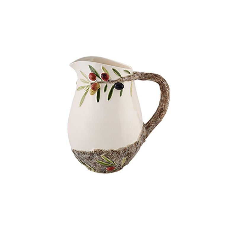 Jarra de loza en blanco roto con diseño de olival, ideal para servir agua, vino o zumos con estilo rústico y elegante. Fabricada en loza de calidad, presenta detalles decorativos con ramas de olivo y aceitunas en tonos naturales. Perfecta para decorar tu mesa o como regalo para amantes de la cocina mediterránea. Dimensiones: 21 x 14,5 x 24,3 cm.