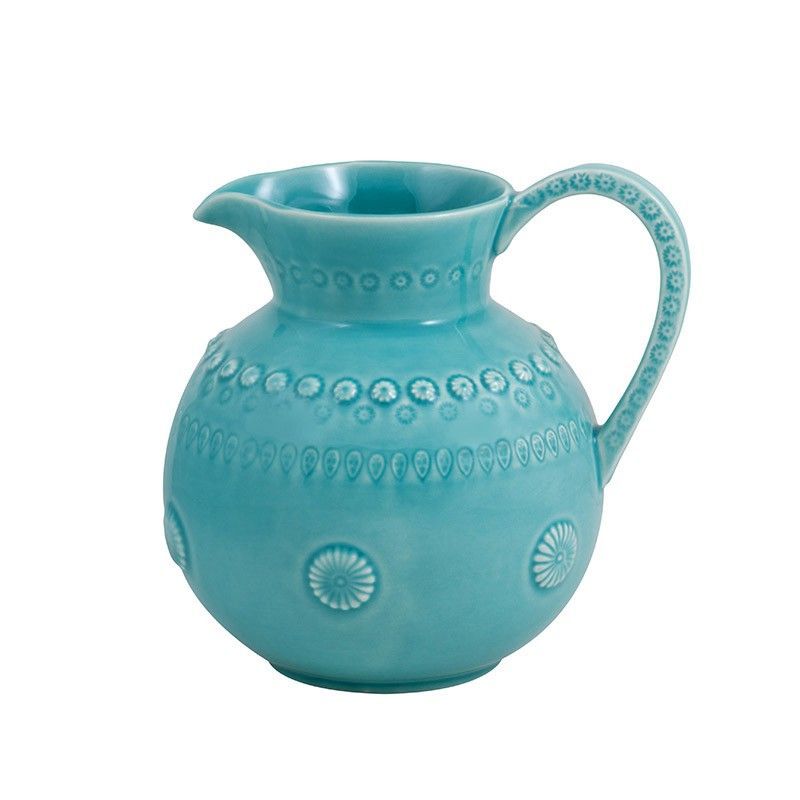 Jarra de loza en color turquesa, ideal para servir agua, jugos o infusiones con estilo. Con diseño decorativo en relieve con motivos florales y circulares, aporta un toque vintage a tu mesa. Hecha de loza de calidad, es resistente y fácil de limpiar. Perfecta para uso diario o como pieza decorativa en cocina o comedor.