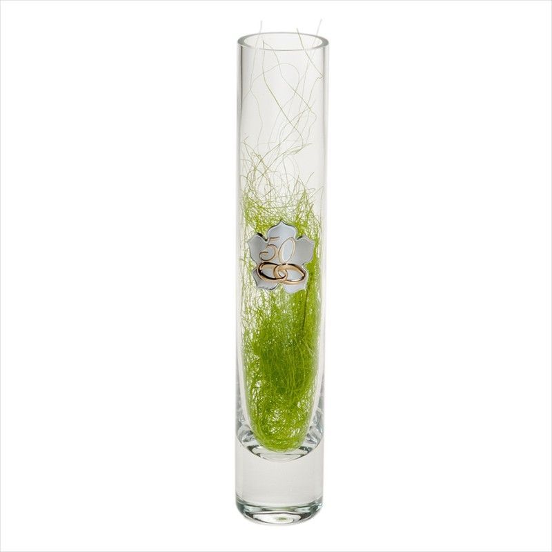 Jarrón conmemorativo de cristal transparente de 25 cm, con diseño de hojas verdes y anillos plateados en su interior. Ideal como pieza decorativa para celebraciones especiales como bodas o aniversarios. Su elegante diseño lo convierte en un regalo único y sofisticado para adultos que buscan detalles con significado.