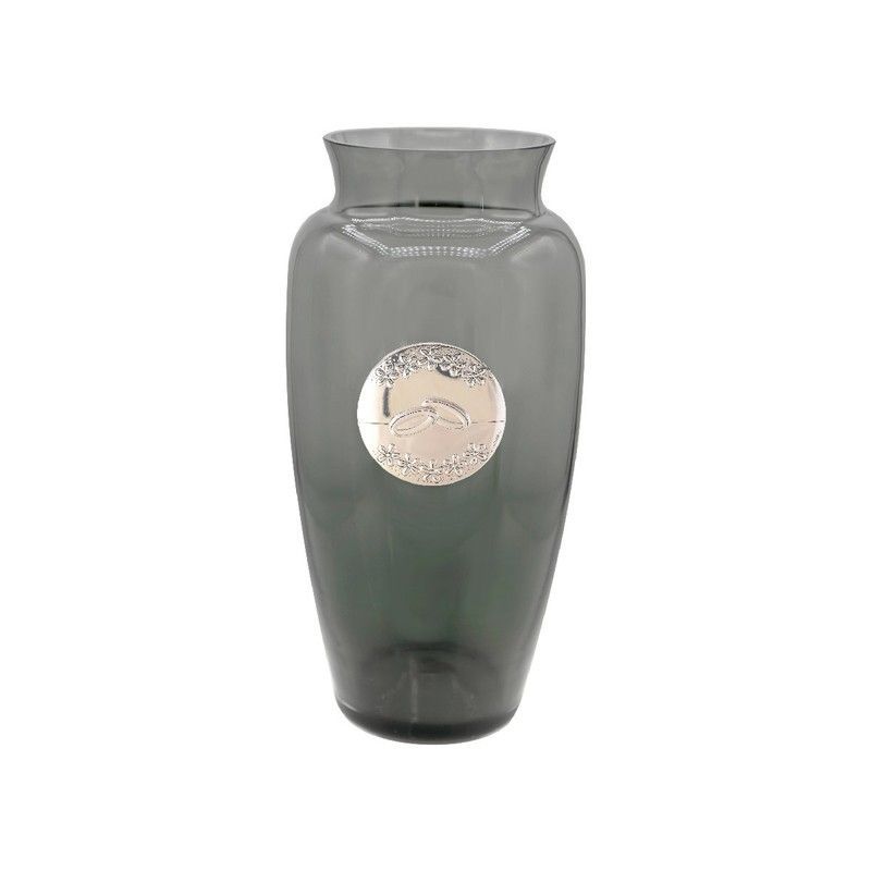 Jarrón conmemorativo de 28 cm en cristal humo azul, ideal para celebraciones especiales como bodas o aniversarios. Con acabado mate y decoración plateada con motivos de alianzas, aporta un toque sofisticado a cualquier espacio. Hecho de cristal de calidad, es perfecto como regalo o pieza decorativa en el hogar.
