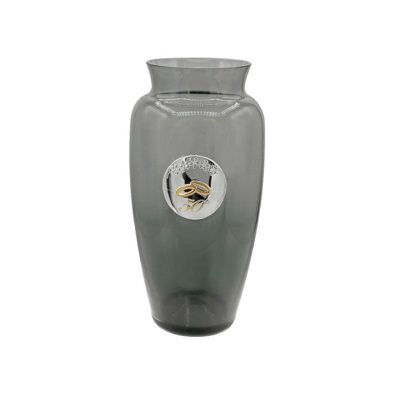 Jarrón conmemorativo de 28 cm en cristal humo azul, ideal para celebrar bodas de oro. Diseño elegante con dos anillos dorados entrelazados y el número '50' sobre fondo plateado con detalles de perlas. Perfecto como regalo simbólico para parejas que celebran 50 años de amor y compromiso.
