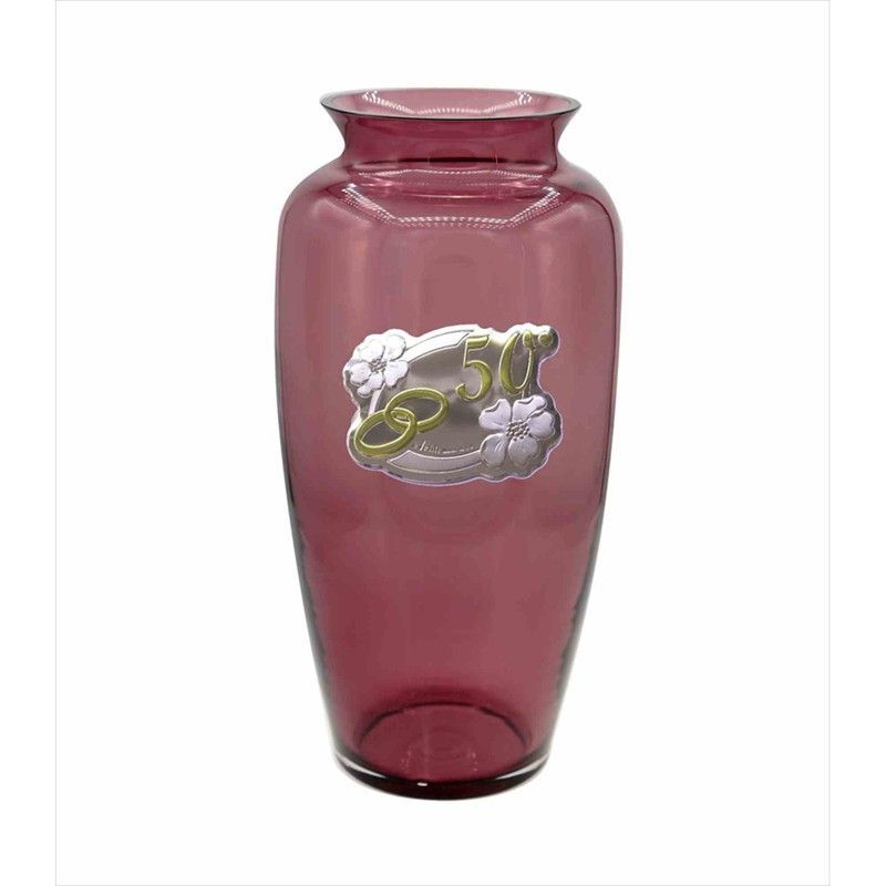 Jarrón conmemorativo de 28 cm en cristal rojo, ideal para celebrar bodas de oro. Diseño elegante con detalles plateados y dorados, incluyendo anillos entrelazados y flores. Perfecto como regalo para parejas que celebran 50 años de amor y compromiso. Calidad duradera y acabado brillante para decorar cualquier espacio con estilo.