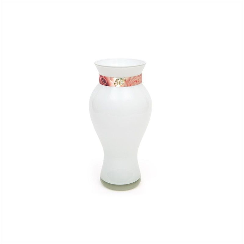 Jarrón conmemorativo EC1011/2CN de la línea Rosa 50 Años, ideal para celebrar aniversarios especiales. Fabricado en cerámica de alta calidad, presenta un diseño elegante con banda floral en tonos rosados y el número '50' en dorado. Perfecto como regalo o pieza decorativa para el hogar.