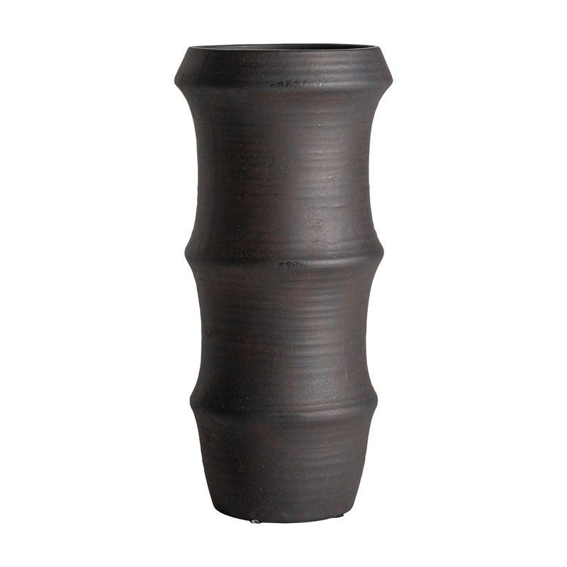 Jarrón Nohae de cerámica en negro, con diseño inspirado en el bambú, ideal para decorar espacios modernos. Su forma cilíndrica con secciones horizontales y acabado mate aportan elegancia y estilo. Perfecto para flores secas, plantas o como pieza decorativa en salón, comedor o oficina. Medidas: 23 x 23 x 47 cm.