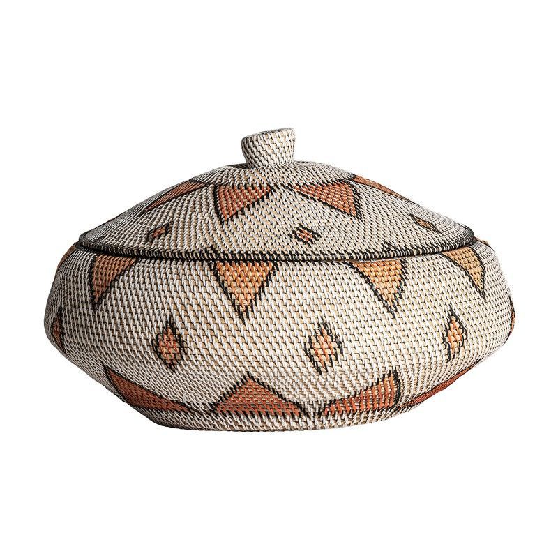 Jarrón decorativo Zirba de ratán en blanco con detalles en naranja y marrón, ideal para decorar espacios de casa y jardín. Diseño geométrico con tapa, fabricado con ratán natural de alta calidad. Perfecto como elemento decorativo en mesas, estanterías o rincones de estilo boho o rústico. Dimensiones: 60 x 60 x 40 cm.