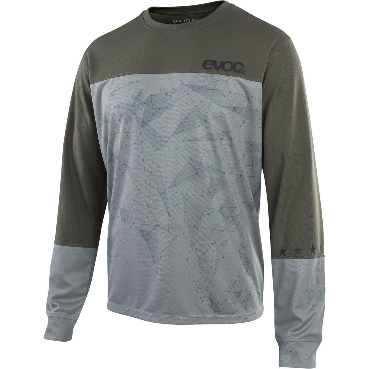 Jersey de ciclismo de manga larga EVOC en color gris y verde oliva, con estampado geométrico abstracto. Fabricado en poliéster de alta calidad, ideal para ciclistas que buscan comodidad y estilo. Diseño técnico con detalles como el logo EVOC y tres estrellas en la manga. Perfecto para entrenamientos y salidas en montaña.