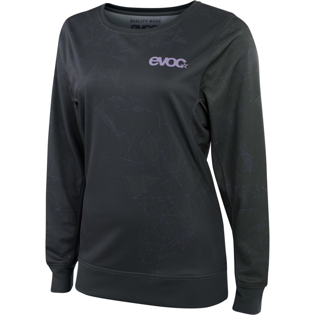 Jersey de manga larga para mujer de la marca EVOC, ideal para ciclismo y actividades deportivas. Confeccionado en poliéster transpirable y resistente, ofrece comodidad y ajuste ergonómico. Diseño en negro con detalles geométricos sutiles y logotipo discreto en el pecho. Perfecto para entrenamientos y salidas en bicicleta en climas frescos.