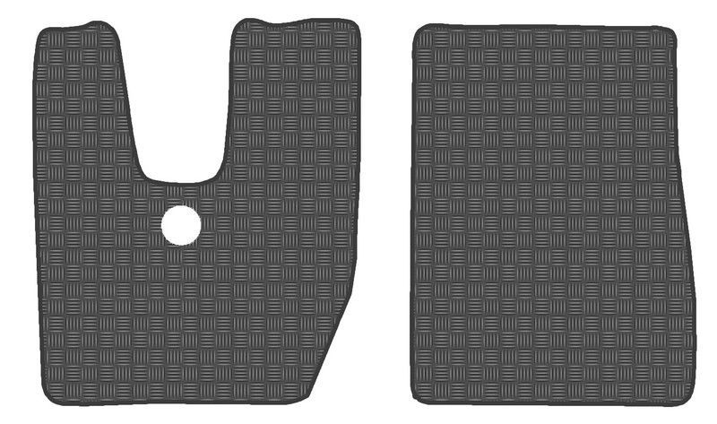 Alfombrillas 'Off Road' negras para IVECO S-WAY (2019-), fabricadas en poliéster y goma antideslizante. Diseño específico con corte en U y orificio para pedal, textura cuadriculada para mayor agarre. Ideales para conductores que buscan protección y estilo en su camión. Fáciles de limpiar y resistentes al agua y suciedad.