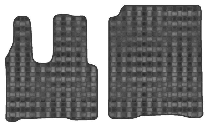 Alfombrillas 'Off Road' negras para Mercedes Actros MP5 (2019-), fabricadas en goma resistente con textura geométrica antideslizante. Diseño específico con recorte para pedalera, ideal para conductores que buscan protección y durabilidad en su cabina. Fáciles de limpiar y perfectas para uso diario en camiones.
