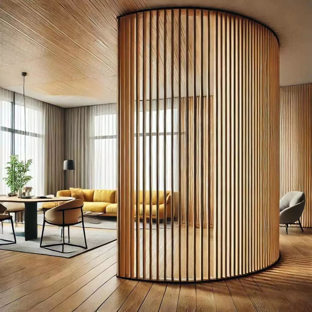 Divisor de espacios cilíndrico con listones de madera natural, ideal para interiores modernos. Diseño elegante y funcional que combina estilo escandinavo con versatilidad. Perfecto para salas, oficinas o zonas comunes. Aporta calidez y privacidad sin perder la luminosidad del ambiente.