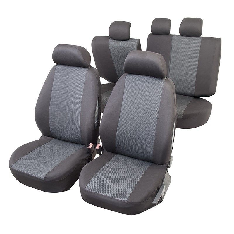 Fundas interiores para coche JGO Atenas T3, calidad básica, en color gris con diseño colorblock. Fabricadas en poliéster resistente, ofrecen protección completa a los asientos con ajuste perfecto. Incluyen fundas para reposacabezas y se adaptan a la mayoría de vehículos. Ideal para mantener la tapicería limpia y protegida con estilo.