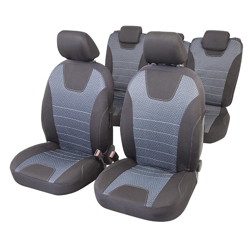Fundas interiores para coche JGO Lyon T5, calidad luxury. Diseño elegante con estampado geométrico en tonos gris y azul. Fabricadas en poliéster y textil resistente, ofrecen protección y estilo a tus asientos. Ideales para adultos que buscan cuidar su vehículo con un toque de lujo. Incluye fundas para asientos delanteros y traseros.