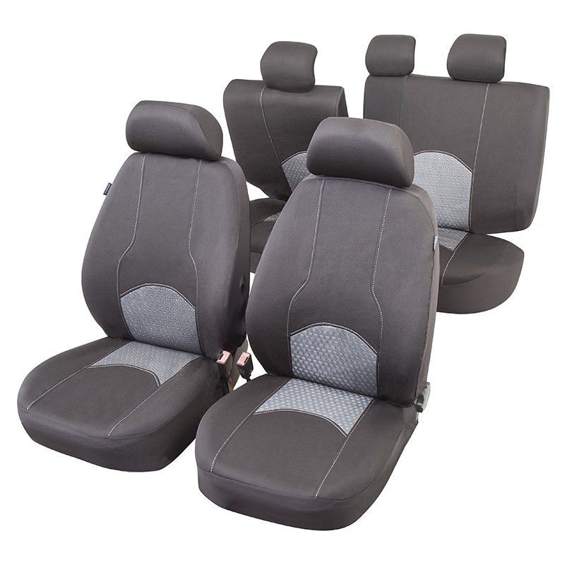 Fundas interiores para coche JGO Moscu T3, calidad elegante y diseño moderno. Fabricadas en poliéster y textil resistente, con costuras decorativas y panel perforado para mayor comodidad. Ideales para proteger los asientos del vehículo y mantener un aspecto impecable. Ajuste seguro con cinturones de seguridad. Perfectas para adultos que buscan esti