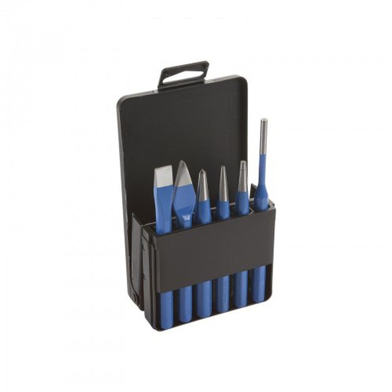Juego combinado de 6 botadores y cinceles ALYCO, referencia 140050, en caja metálica negra con asa. Ideal para trabajos de bricolaje, reparaciones y trabajos manuales. Mangos azules ergonómicos y puntas de acero inoxidable para mayor durabilidad. Organizado en compartimentos individuales para un fácil acceso y almacenamiento seguro. Perfecto para p