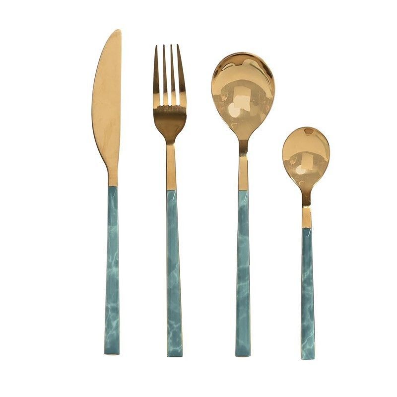 Juego de 16 cubiertos de la colección Sea Side, con acabado dorado y manijas en tono verde con efecto mármol. Fabricado en acero inoxidable de alta calidad, ideal para comidas elegantes o diarias. Aporta un toque sofisticado a tu mesa con su diseño moderno y duradero.