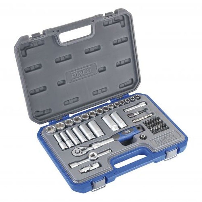 Juego de 54 piezas con llaves de vaso de 3/8'', carraca extensible de 72 dientes y diferentes accesorios Alyco, Referencia 192287