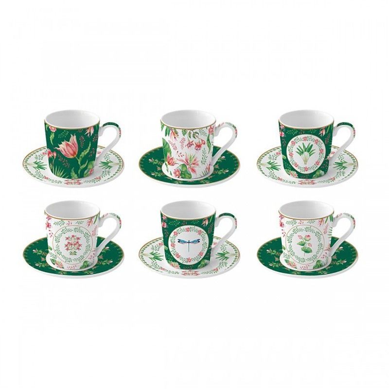 Juego de café de porcelana con diseño botánico en tonos verde y rosa, ideal para amantes de la naturaleza. Incluye seis tazas y platillos con bordes dorados y estampados florales únicos. Perfecto para desayunos elegantes o como regalo sofisticado. Calidad premium, fácil de lavar y resistente.