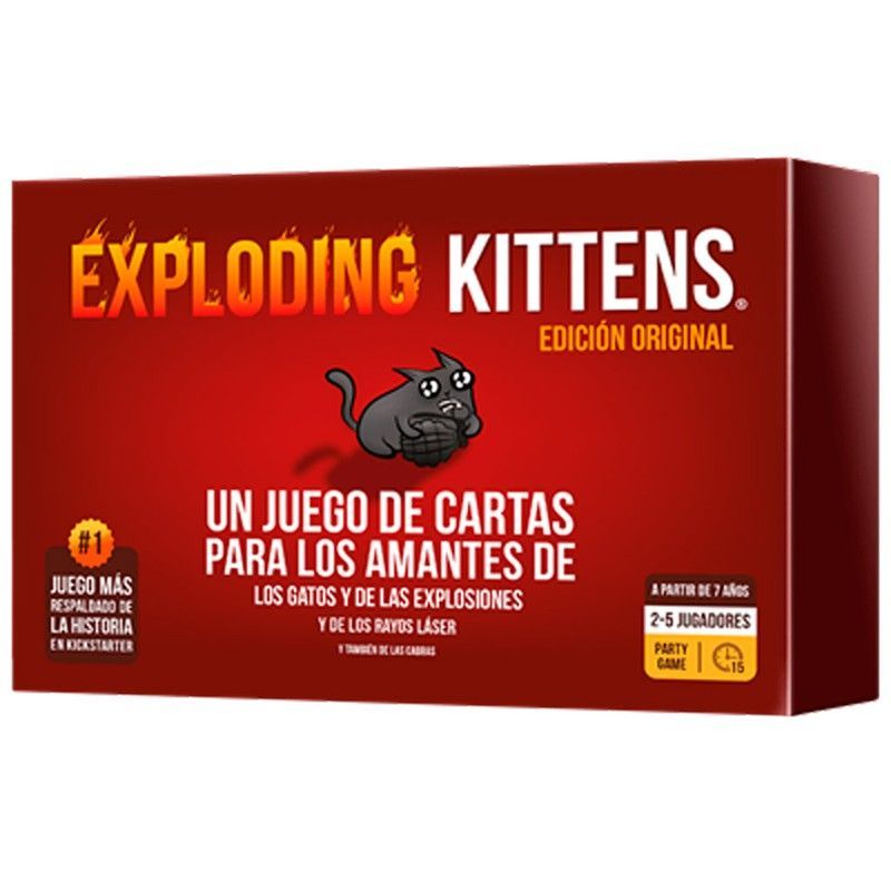 Juego de cartas Exploding Kittens Edición Original, ideal para niños y adultos a partir de 7 años. Divertido y rápido, para 2-5 jugadores. Con diseño llamativo en caja roja y gato negro explosivo. Perfecto para partidas familiares o entre amigos. ¡El juego más respaldado en Kickstarter!