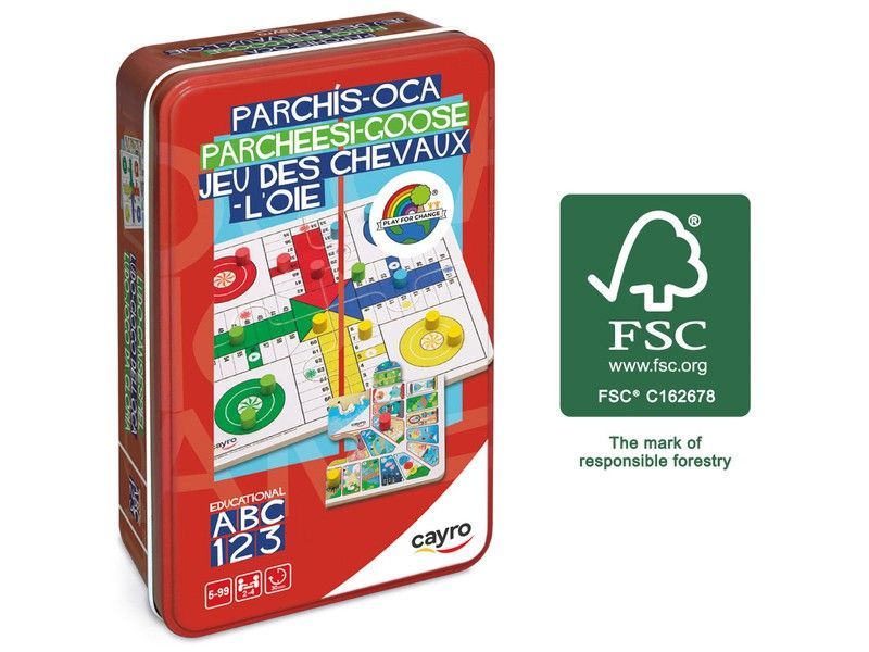Juego de mesa Parchís-Oca versión viaje en lata metálica, ideal para niños y familias. Incluye tablero compacto con casillas coloridas y fichas de juego. Perfecto para llevar en viajes o vacaciones. Diseño atractivo con colores vivos y certificación FSC para un juego sostenible. Diviértete con este clásico juego de estrategia y suerte.
