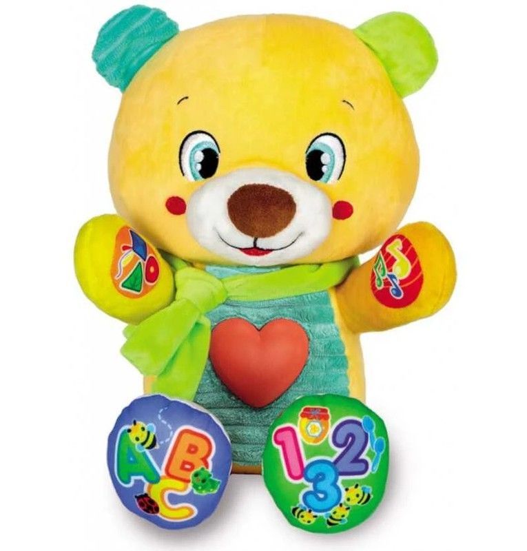 Julián, Abraza Y Aprende es un juguete educativo para bebés y niños pequeños. Con forma de oso amarillo y detalles coloridos, ayuda a desarrollar habilidades motoras y cognitivas. Incluye botones con números y letras en manos y pies, y un corazón rojo en el pecho. Ideal para estimular el aprendizaje temprano con materiales seguros como plástico y t
