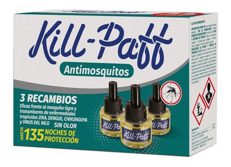 Kill-Paff Antimosquitos Recambio Triplo: caja con 3 recambios eficaces contra el mosquito tigre y transmisores de enfermedades tropicales como Zika, Dengue y Chikungunya. Sin olor y con hasta 135 noches de protección. Ideal para uso en hogar y jardín. Embalaje seguro y fácil de usar.
