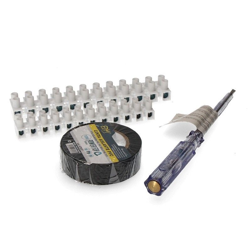 Kit de bricolaje EDM ideal para trabajos eléctricos y reparaciones en casa. Incluye conectores de plástico blanco, cinta aislante negra de alta calidad y destornillador con mango transparente azul y punta metálica dorada. Perfecto para usuarios que necesitan herramientas prácticas y duraderas para proyectos de jardinería o mantenimiento doméstico.