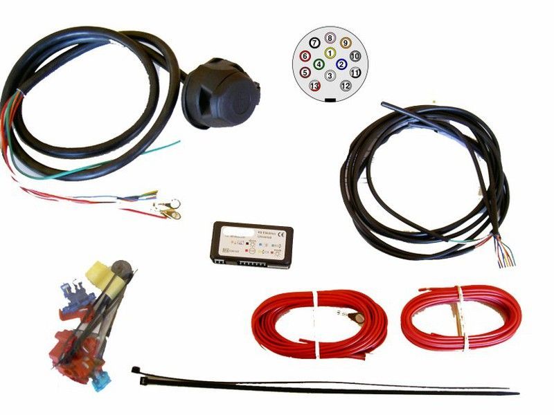 Kit eléctrico de 13 pines con tecnología Canbus, ideal para vehículos motorizados. Incluye cables de alta calidad, conector con diagrama de identificación de pines, módulo electrónico y conectores de colores para una instalación precisa y segura. Perfecto para sistemas de iluminación y electrónica automotriz.