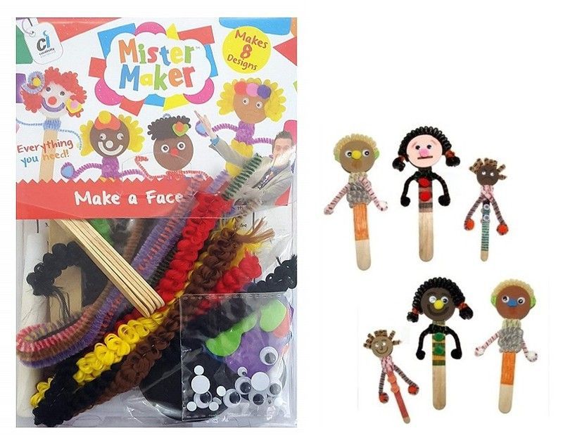 Kit de manualidades 'Mister Maker: Make a Face' para niños, ideal para fomentar la creatividad. Incluye palitos de madera, cintas de colores, ojos de plástico y accesorios para crear caras divertidas. Perfecto para actividades artísticas en casa o en clase. ¡Últimas existencias!