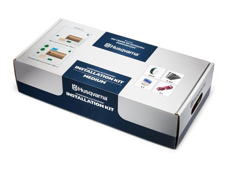Kit de instalación Automower para jardines medianos de Husqvarna. Incluye todos los componentes necesarios para una instalación sencilla y eficiente del robot cortacésped. Ideal para usuarios que buscan una solución completa y profesional. Contenido en caja de cartón con instrucciones visuales.