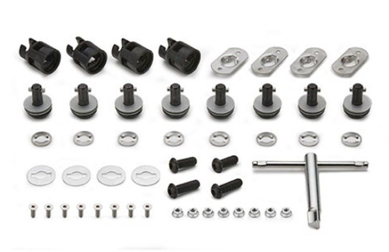 Kit RAPID RELEASE 01RKIT para montaje rápido de portaequipajes en vehículos motorizados. Incluye pernos, tuercas, arandelas y soportes de plástico y metal, con llave de ajuste en acero inoxidable. Ideal para usuarios que necesitan una instalación segura y rápida. Diseñado para una fijación firme y duradera en vehículos.
