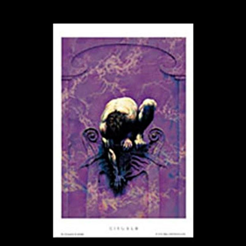 Lámina Aluxe con diseño artístico de estilo abstracto, ideal para coleccionistas y amantes del arte. Presenta una figura central en tonos oscuros sobre fondo morado texturizado, con detalles en blanco y negro y elementos decorativos ondulados. Perfecta para decorar espacios con estilo único y personalidad. Calidad premium para exhibición.