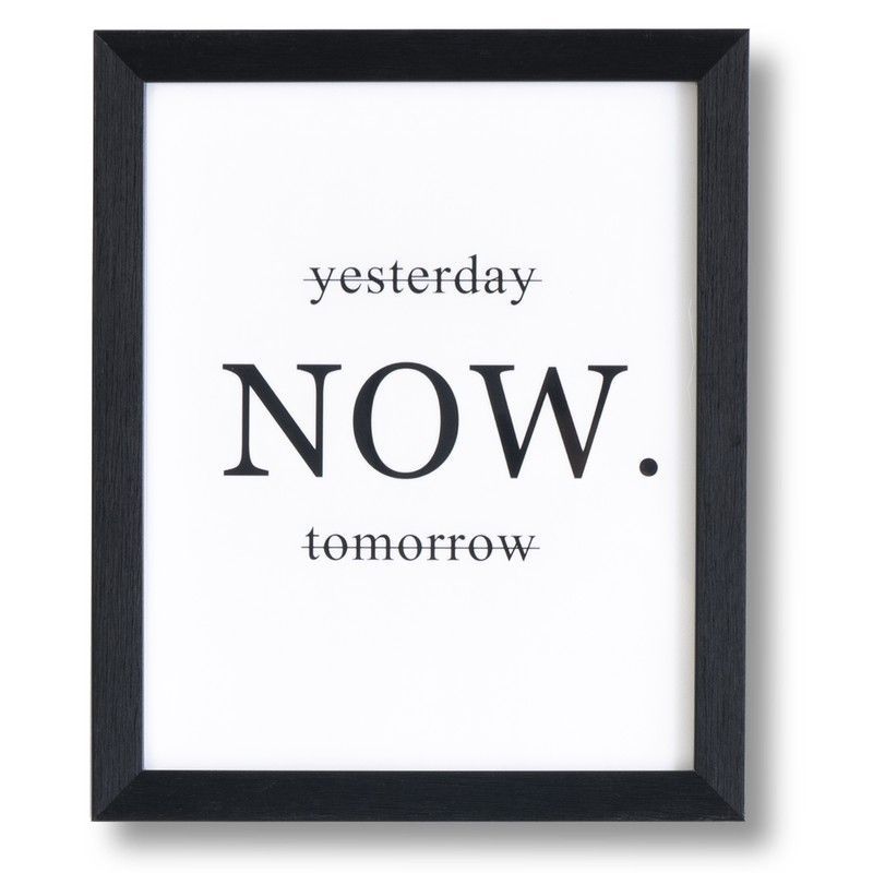 Lámina decorativa con texto motivacional 'yesterday NOW. tomorrow' en blanco y negro, ideal para decorar paredes en salas, oficinas o espacios de trabajo. Con marco negro de madera y fondo blanco, aporta estilo minimalista y moderno. Perfecta para recordar la importancia del presente. Dimensiones: 25x3x30 cm.