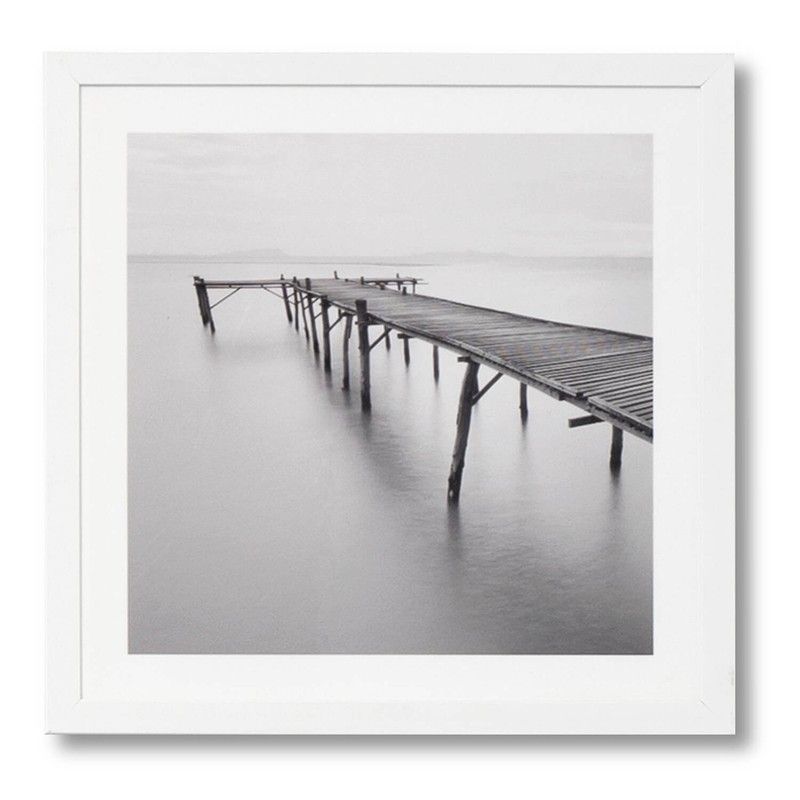 Lámina PIER con marco blanco, ideal para decorar espacios modernos y minimalistas. Imagen en blanco y negro de un muelle sobre agua, con efecto de larga exposición que transmite calma y serenidad. Perfecta para salas, dormitorios o oficinas. Dimensiones: 40x3x40 cm. Diseño elegante y contemporáneo.
