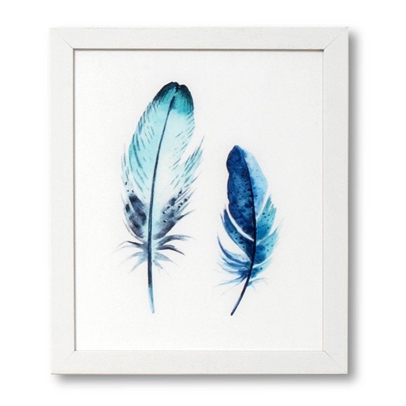 Lámina decorativa con diseño de plumas en acuarela, en tonos azules sobre fondo blanco, enmarcada en madera blanca. Ideal para decorar salas, dormitorios o espacios con estilo minimalista o bohemio. Calidad artística y acabado elegante para un toque sofisticado en tu hogar.