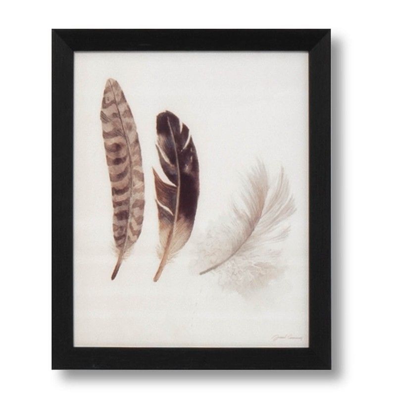 Lámina decorativa con diseño de tres plumas naturales en tonos marrones sobre fondo blanco, enmarcada en negro. Ideal para decorar paredes en espacios con estilo rústico, escandinavo o minimalista. Aporta calidez y elegancia a salas, dormitorios o oficinas. Fácil de colgar y mantener.