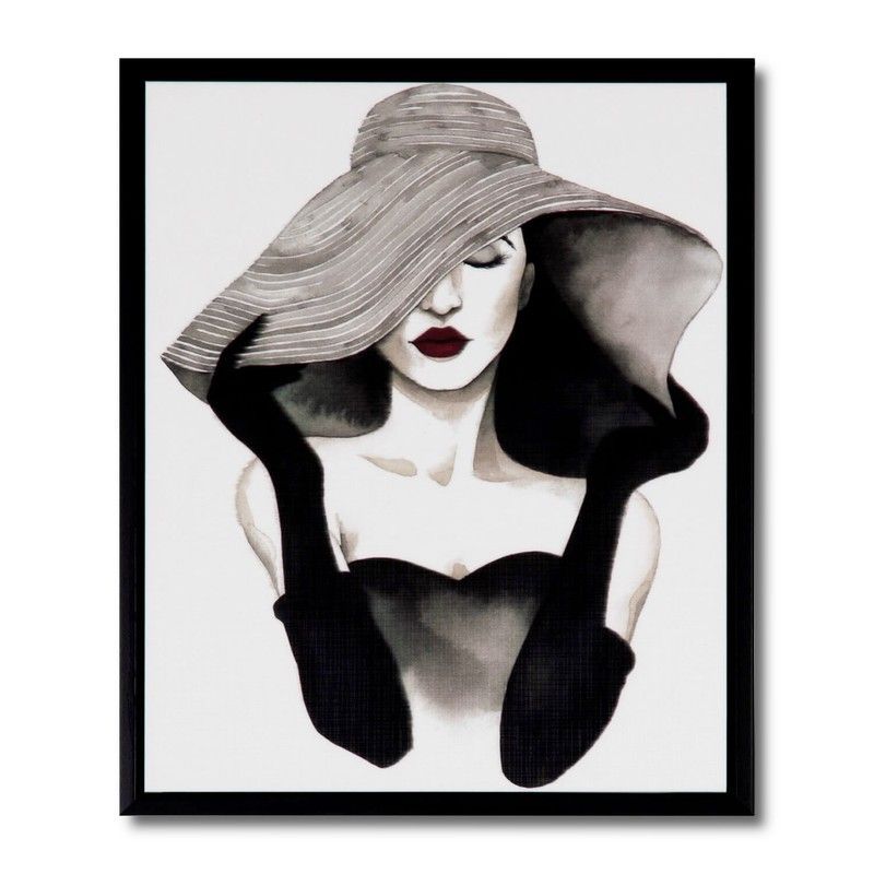 Lámina decorativa con ilustración artística de mujer elegante con sombrero y guantes negros, labios rojos, estilo minimalista y sofisticado. Ideal para decorar salones, dormitorios o espacios con estilo moderno. Con marco negro, fácil de colgar y perfecta para amantes del arte contemporáneo.