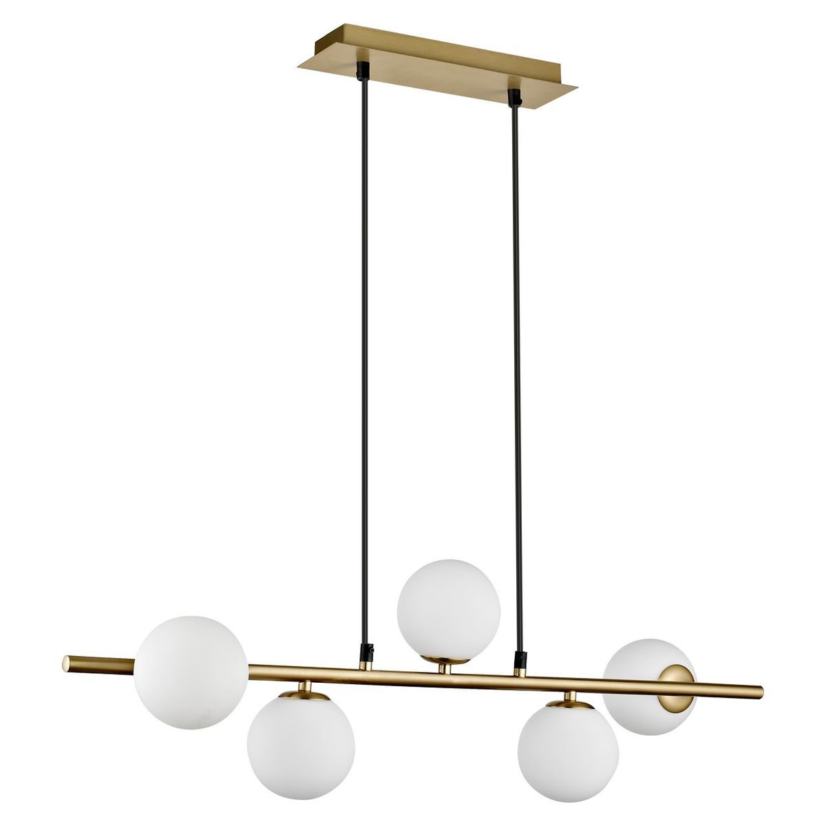 Lámpara colgante River de 5 luces con acabado en latón y esferas de vidrio opalino blanco. Diseño moderno y elegante, ideal para iluminar comedores, cocinas o salas. Estructura metálica dorada con suspensión por cables negros. Aporta un toque sofisticado y luminoso a cualquier espacio interior.