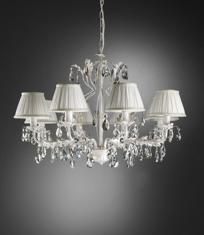Lámpara colgante de 8 luces Serie Karen Onli, ideal para salones, comedores o dormitorios. Con estructura metálica en acabado blanco y cristales transparentes que aportan brillo y elegancia. Incluye sombrillas de tela blanca con pliegues para un toque sofisticado. Diseño clásico perfecto para espacios con estilo tradicional o vintage.
