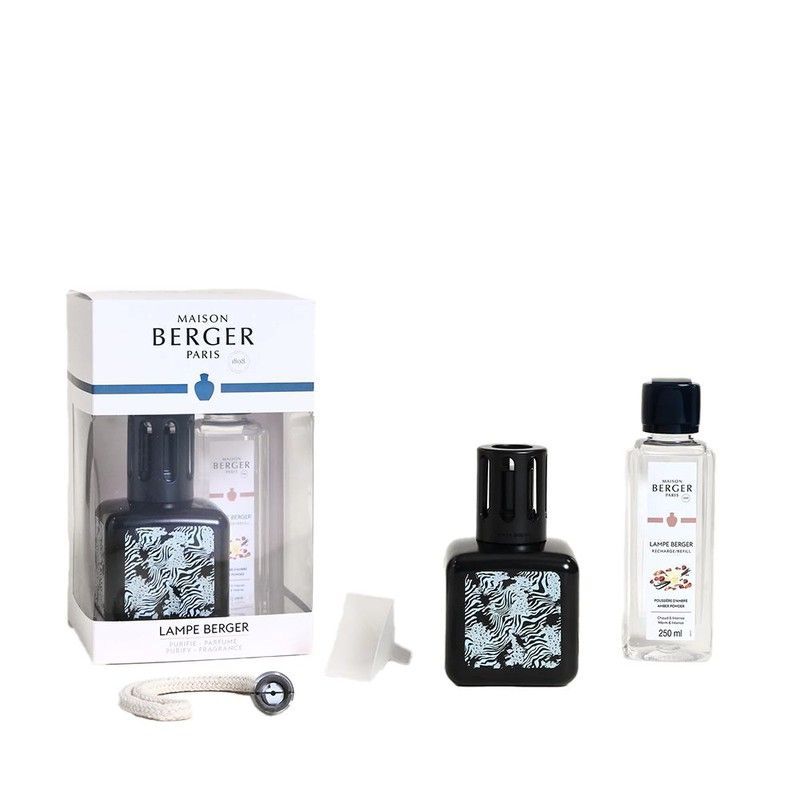 Pack Lampe Berger Glacon Animal: lámpara catalítica con elegante diseño animal print en blanco y negro, ideal para perfumar espacios con estilo. Incluye botella de aceite aromático, mecha y herramienta de limpieza. Perfecta para hogares modernos que buscan un toque sofisticado y aromas duraderos. Diseño francés de Maison Berger Paris.